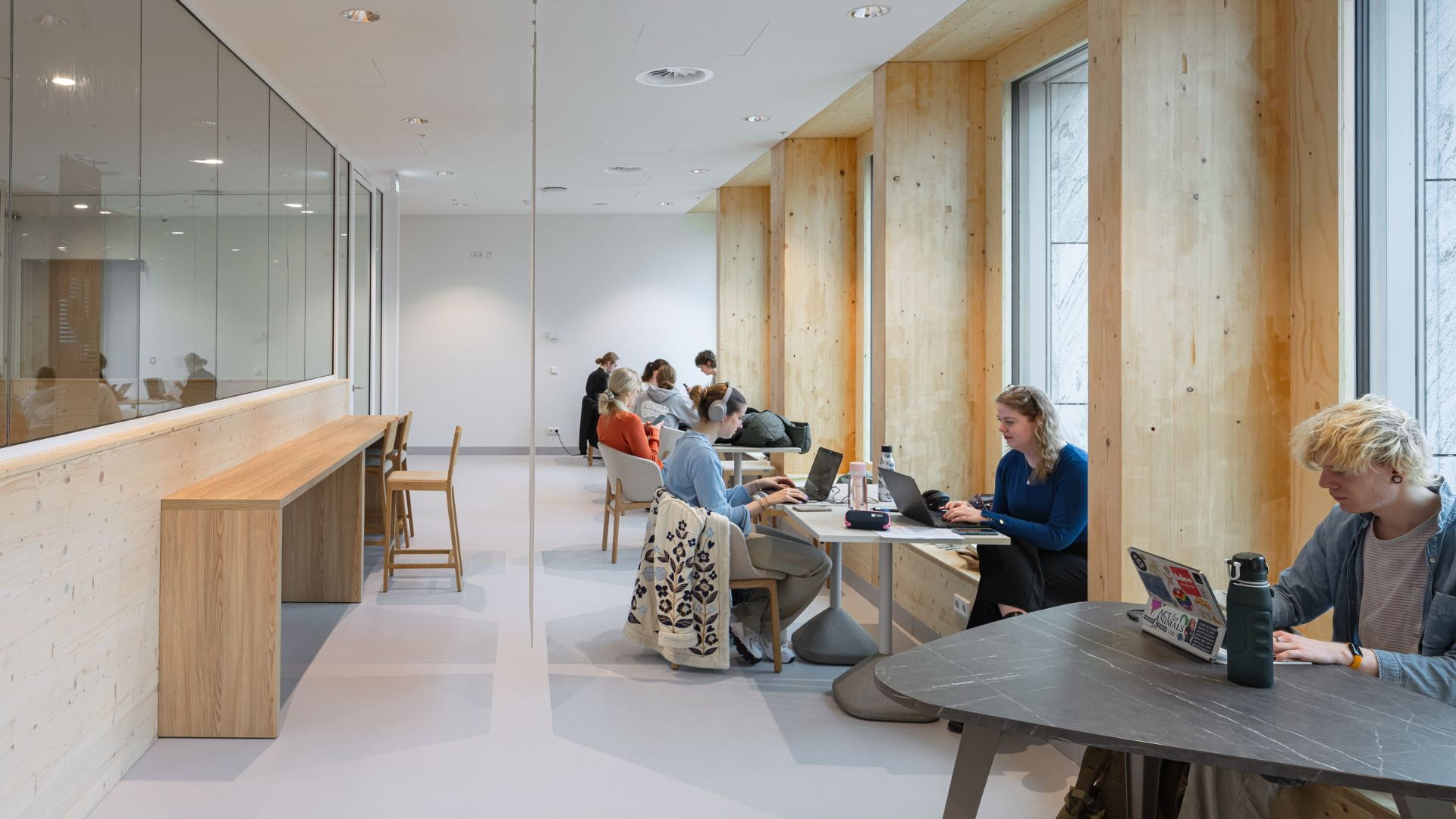 The chosen location for the new building on campus is right next to the railway line which means that it is exposed to a high level of noise. Tilburg University also wants to turn its circular ambitions into action to set an example for others. Timber construction was therefore chosen to make the best use of scarce resources. Building components are connected so that they can be taken apart. A minimal amount of adhesive or sealant has been used. Demountable timber construction presents different challenges with regard to comfort and acoustics compared with more traditional materials such as concrete and steel. Using wood requires special attention to be paid to fire and evacuation safety for integrated design solutions. Through close collaboration with the various disciplines, we gathered all the requirements for this compact building.